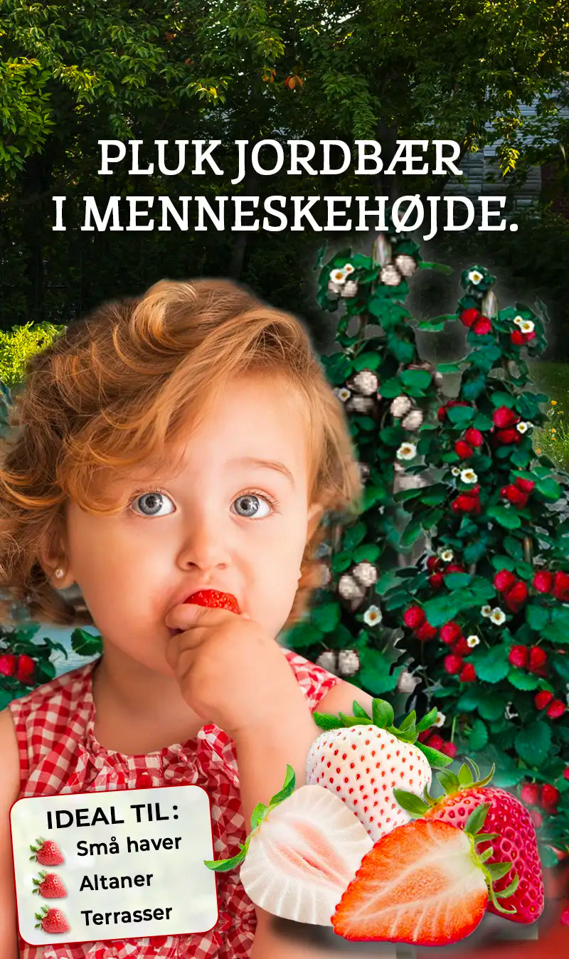 Denne helt nye sort kan klatre op til 1,20 meter og mere. I 5 måneder hvert år er de fyldt med smukke jordbær. I denne højde kan du høste store jordbær fulde af en smag, som vi havde glemt, og det uden at blive snavsede.