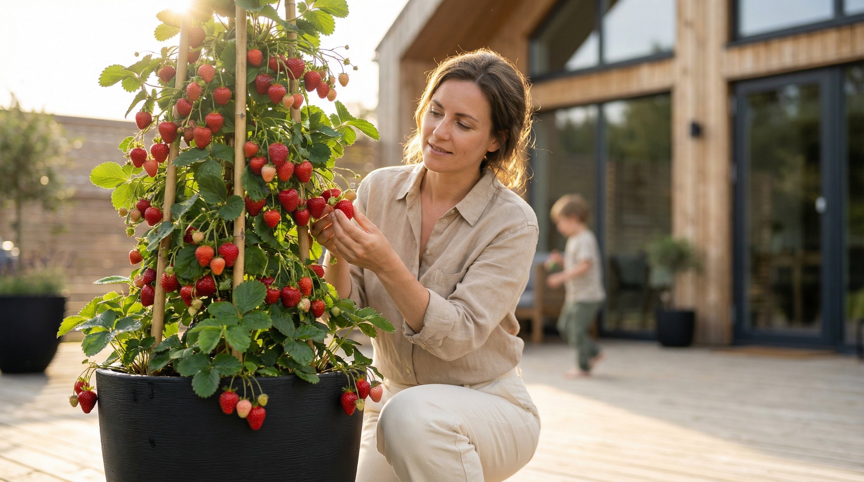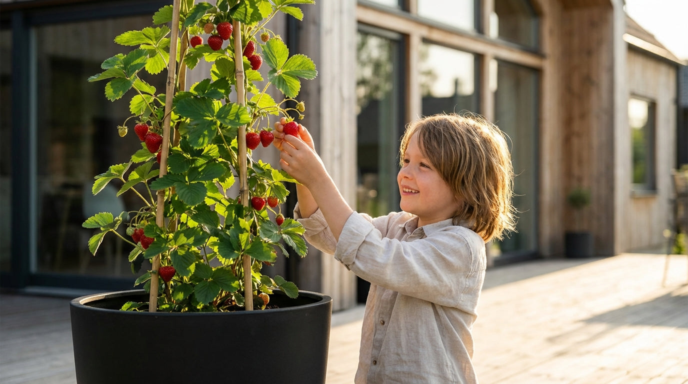 Forestil dig glæden hos dine børn, når du tillader dem at plukke, i armshøjde, disse store søde, modne, rene og jordfri frugter af "din klatrende jordbærplante". Du høster indtil den første frost, længe efter den normale jordbærsæson, og år efter år vil de fortsætte med at give dig en utrolig høst af store, lækre bær.