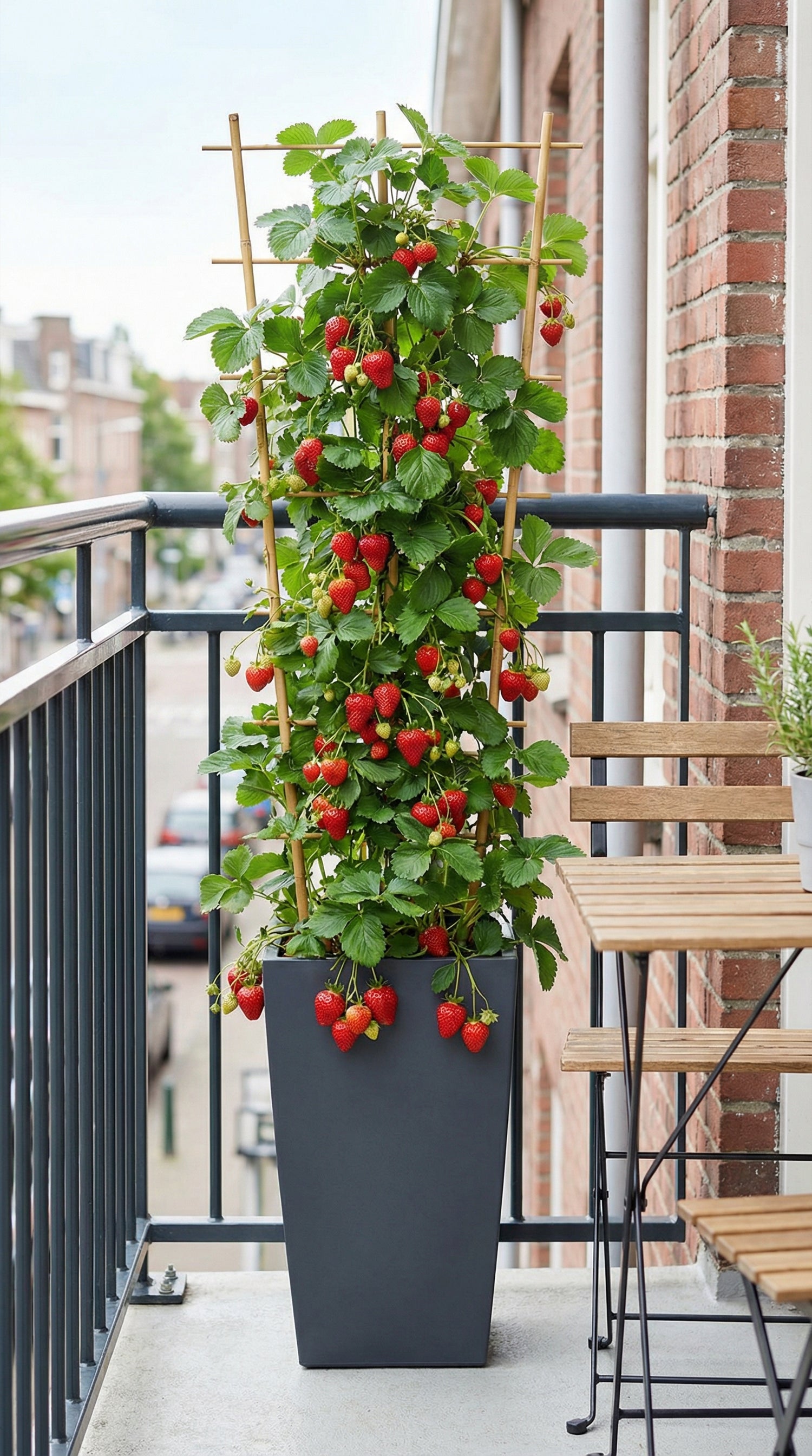Denne helt nye sort kan klatre op til 1,20 meter og mere. I 5 måneder hvert år er de fyldt med smukke jordbær. I denne højde kan du høste store jordbær fulde af en smag, som vi havde glemt, og det uden at blive snavsede.